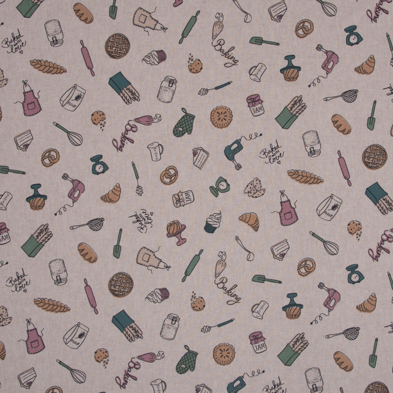 Linnenlook is een mooie/sterke kwaliteit stof met natuurlijke uitstraling doordat het op linnen lijkt, maar geen linnen bevat. Het is namelijk 80% katoen en 20% polyester. Linnenlook stoffen zijn in talloze prints en motieven zoals deze met bakgerei motief.